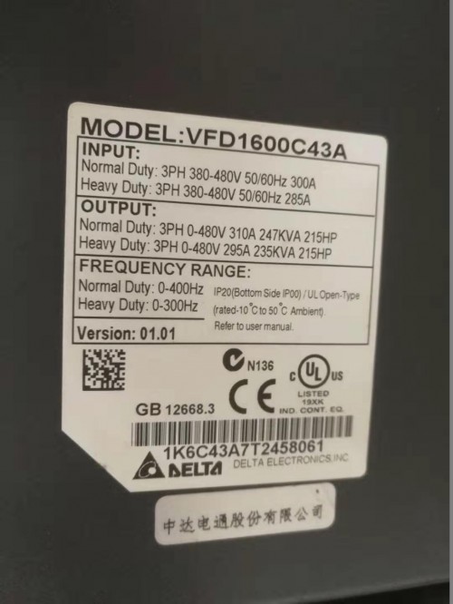 变频器1台;二手,售价8000元,完好少用。型号:CFD1600C43A;* :台达。电话:18805312518,联系人:左工。