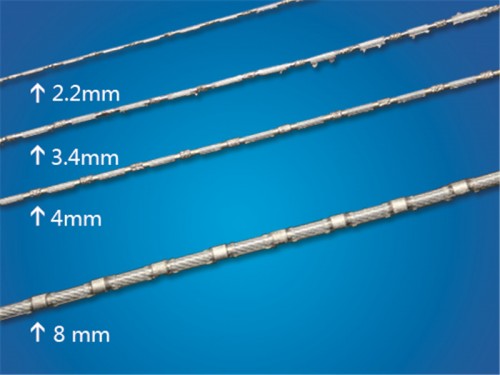 我公司目前开发三种超细绳锯,分别是 2.2mm 3.4mm 4.0mm三种规格。其中2.2mm绳锯主要用在玉石等名贵材料以及多晶硅的加工;3.4和4.0主要使用于大理石、水泥、耐火砖、有色金属等硬度比较低的材料各种形状的切割,本品和常规绳锯相比,切割锯缝比普通7.2绳锯小4mm左右,以厚度20mm厚的弧板为例,石材的出材率会提高20%;超细绳锯配套设备电机在4千瓦左右,一天的耗电量是普通设备的一半左右.可以有效降低企业成本,提高石材利用率。