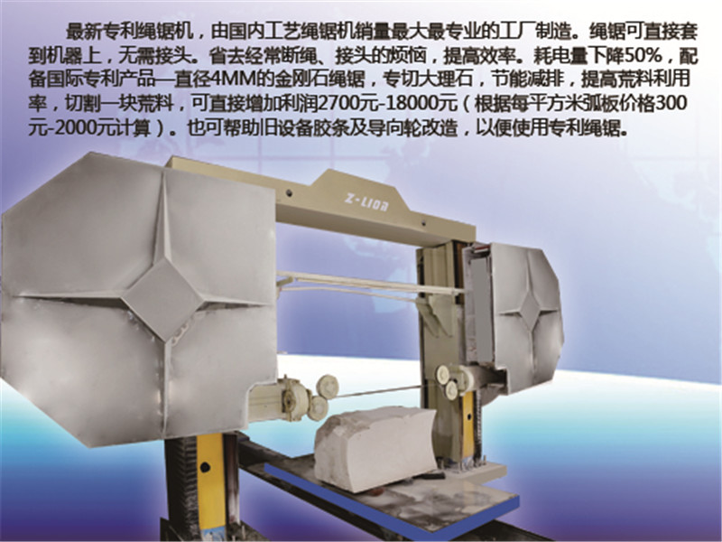 多功能拼花机,可根据需要切出各种形状和图案,可配备2.2 3.4 4.0多种绳锯,接头可以多次拆卸,满足封闭图案切割。异性石材加工绳锯机,可以切割多种石材的任意二维图形,石材切割尺寸可以达到3.0*2.0*2.0m荒料,改进后可以配合使用无接头绳锯,大大降低断绳机率。 4.0绳锯切割大理石弧板现场,锋利度稳定,以1.2m宽的中硬大理石为例,切割速度能达到25mm/min;4.0细绳锯可以有效提高石材利用率,以20厚度的板材为例,石材出材率提高20%。请继续查看以下,太阳能材料切割,四川绳锯机,湖北绳锯机的信息
