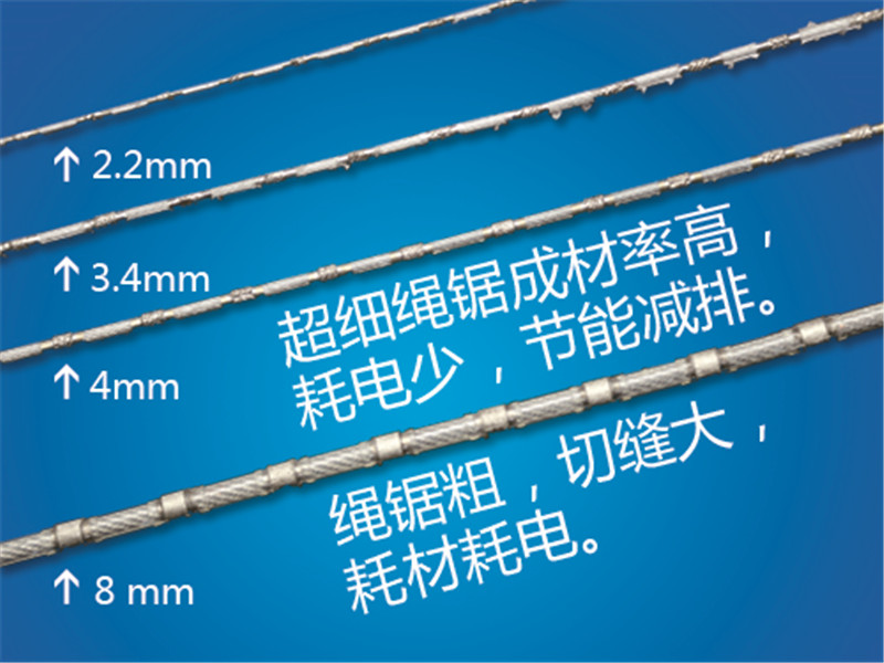 我公司目前开发三种超细绳锯,分别是 2.2mm 3.4mm 4.0mm三种规格。其中2.2mm绳锯主要用在玉石等名贵材料以及多晶硅的加工;3.4和4.0主要使用于大理石、水泥、耐火砖、有色金属等硬度比较低的材料各种形状的切割,本品和常规绳锯相比,切割锯缝比普通7.2绳锯小4mm左右,以厚度20mm厚的弧板为例,石材的出材率会提高20%;超细绳锯配套设备电机在4千瓦左右,一天的耗电量是普通设备的一半左右.可以有效降低企业成本,提高石材利用率。厦门致力金刚石科技股份有限公司创始于2002-07-09。在竞争日益艰难的建材生产加工机械行业中力争上游,创办至今已为广大企业提供了数不胜数的超细绳锯,*的产品品质获得了企业一致肯定。