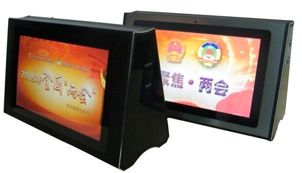 双面电子桌牌 终端采用双面7寸高分辨率(1024*600dpi)LCD液晶屏。 外观设计高雅。UI界面极简至尚,人性化直观操作。 电容式触摸屏,支持多点触控,让无纸化会议及各项操作更便捷*。 基于千兆会议媒体流技术设计,所有音、视频、控制信号通过一条Cat.6千兆网线传输。 支持无线WIFI接入方式。 终端集成了丰富的会议系统功能。系统可实现会议视频签到、会议资料查看、投票表决、会议通知、会议计时、呼叫服务等会议功能和服务。 可订制化的会议功能模块(会议功能可按客户要求订制)。 全铝外壳,一次成型,倒角高光处理,无缝隙,稳重、美观。外壳及操作界面颜色可根据用户需求订制。