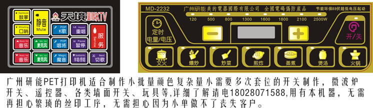 我公司生产的PET彩色薄膜片材打印机,专门针对短板薄膜开关产品而研发。无需做任何涂层处理,来图即可直接打印在各类PET片材上,加硬或者不加硬均可,适合颜色多变,丝印难度大,产品量小的订单。拥有本设备,就无需再担心小批量的订单做不了了,产品有以下优点: