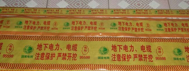 地埋警示带又称标记带它施工方便,施工与埋管同时进行,埋覆于地下与管线中间,铺设在管道上面30-50CM处,起到警示标志作用,是各种直埋式管道、线缆安全防护的经济有效、简单易行的保护用品。