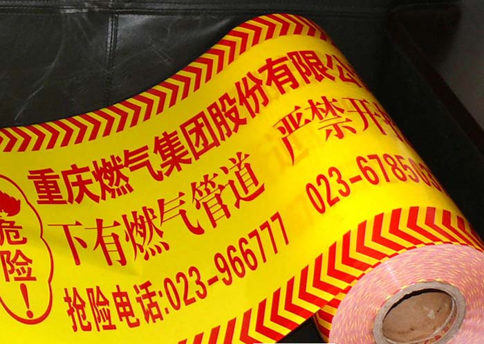 燃气警示带一般铺设在地下于地下管道,光缆等配合使用,可以让施工人员正确的探测到管道,电缆所处的位置,以免造成管道破损等后果。起到安全警示的作用.它还可根据客户要求定制厚度,里面含有金属丝,具有可探测的功能,能给施工带来诸多的方便;