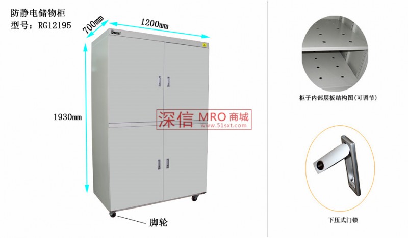 防静电储物柜GR12195为西安深蓝电工技术有限公司所生产的产品。防静电柜子柜体高1930mm,长度1200mm,宽度700mm。本产品采用下压式门锁,方便、好用。柜体内部可放置层板,层板数量可选,层板位置可调节。柜体采用进口防静电粉末进行喷涂,颜色为浅灰色,喷涂效果均匀,防静电效果佳!联系人:王居思;联系电话029-89167751。