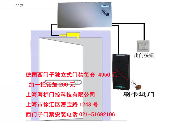 德国西门子门禁,独立式,每套4950元,(包含德国西门子门禁控制器1台,西门子读卡器1台,门禁电锁1把,电锁支架,门禁电锁支架一个,门禁电源1台,门禁感应卡20张,西门子出门开关1个,门禁所需线材,安装调试培训,和一年的免费上门维保,含税价格)