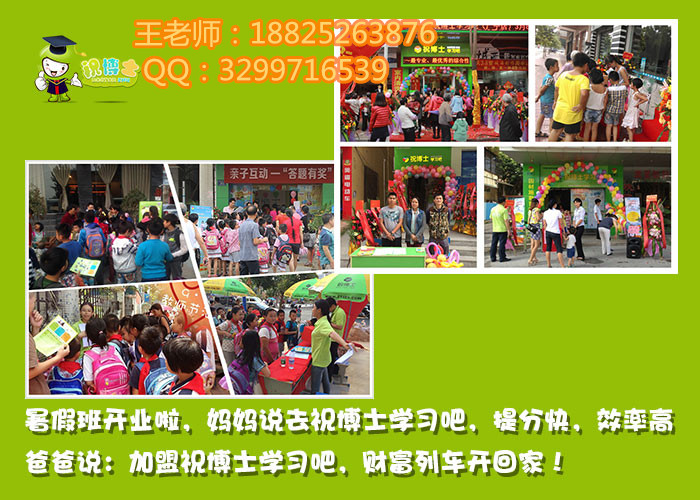 不管您是家长,还是80,90创业者,只要您关心孩子,只要您想赚钱,只要您想做一份自己的事业,那么就请来加盟我们的祝博士学习吧。不需要任何项目经验,只要您有信心做好,只要您相信我们,我们一定会尽自己大的努力与支持,与您携手前行,创造明天的财富。(欢迎想要赚钱,想要做一份属于自己事业的朋友来电咨询!)