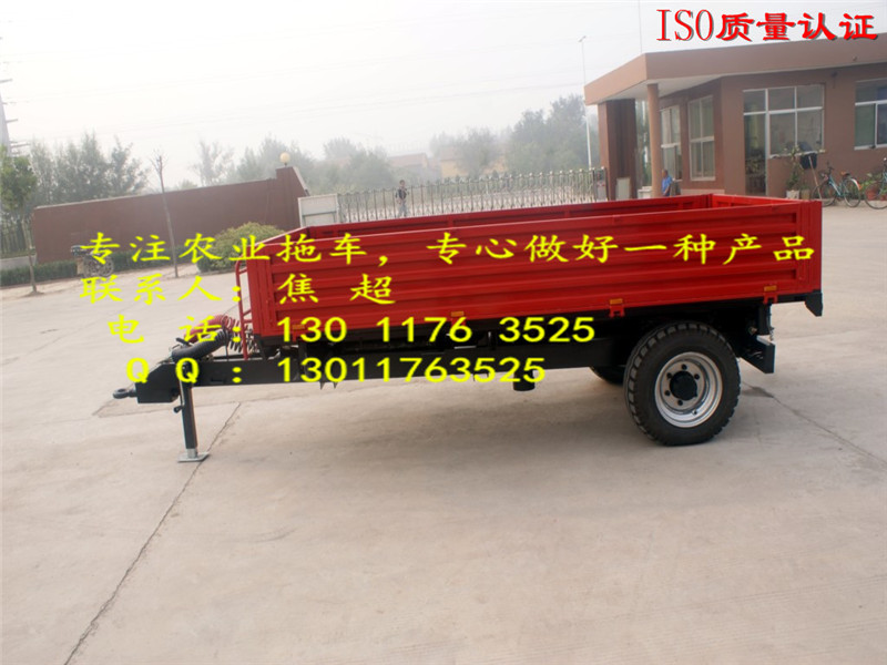 农用四轮拖拉机拖挂车是由拖拉机牵引运输物料的农用车辆,也称农用拖车,是农业生产中重要的机械化运输方式。小型轮式或手扶拖拉机牵引小型挂车进行短途或田间运输,适应小规模农业生产经营的需要。由大、中型轮式拖拉机牵引挂车运输粮食、农用物资等,可充分发挥拖拉机的作用,适应大规模农业生产经营的需要。 气路连接形式:气管快接头。 电路连接形式:螺旋七芯线快插头。 油路连接形式:快换接头。 表面处理:大型抛丸机消除焊接应力、除锈、除氧化皮、防锈漆、面漆、烤漆处理。 焊接工艺:CO2工装焊接。