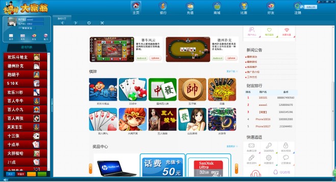平台风格类似QQ游戏,联众等休闲娱乐平台,实现了一款平台多种游戏的组合方式,现有游戏多种可选,和多种手游实现互联互通,同时可接受客户个性化定制。