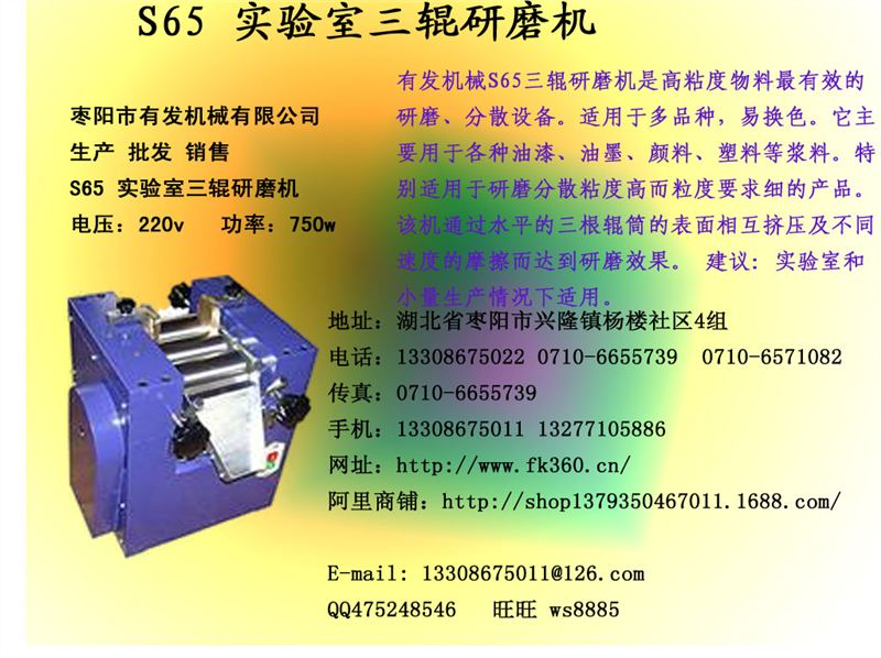 湖北枣阳市有发机械公司生产供应-YFS-65三辊研磨机主要用于各种油漆、油墨、颜料、塑料等液体浆料前期实验需要,为生产提供正确的数据。