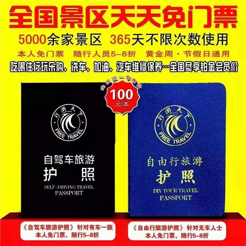 行游天下自驾旅游护照:100元一本,一年有效期,*,节假日通用,持护照到签约的5000家景区本人免门票!!!同行人员还打5到8折!!!持护照到签约的酒店、宾馆、牛肉面、KTV、加油站、修理厂、快递、购物中心等商家,还可以提供优惠服务。