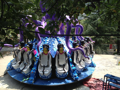 章鱼陀螺是继我厂旋转大章鱼之后又自主研发推出的一款新型游乐设施,该产品自问市以来,受到众多投资者的青睐,这款章鱼陀螺也叫小章鱼,它是在旋转大章鱼和迪斯科转盘的基础上进行升级改造,可以集摇摆、旋转为一体,其趣味性非常强,每一个座舱由一个个可爱的企鹅组成,加上动感好听的音乐,运行起来异常地漂亮,这款设务有两个款式,分为16座和24座两款,占地直径大概在6米左右。