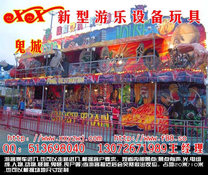 鬼城</p><p>游客乘车进入,也可以走路进入,根据客户要求。观看内部景点(景点有声,光,电组成,人物,动物,怪兽,鬼怪,丧尸等)当游客接近后会突然做出反应。占地20米?10米,也可以根据场地尺寸定制
