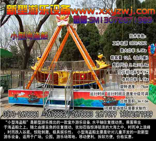 工作电源 380V/50HZ </p><p></p><p>功率 2.5Kw </p><p></p><p>载客量 12人(含儿童) </p><p></p><p>整机尺寸 5.5m×8.8m </p><p></p><p>空压机功率 1.1Kw </p><p></p><p>电机功率 1.1Kw </p><p></p><p>旋转速度 1.78pm </p><p></p><p>运行时间 运行时间及速度分级可调 </p><p></p><p>占地面积 3m×6m</p><p></p><p>(可根据场地环境要求制作)</p><p>“小型海盗船”是新型游乐推出的一款室外游乐设备,水平轴往复摆动类,乘客乘坐于海盗船之上,随之由缓至急的往复摆动,犹如莅临惊涛骇浪的大海之中,时而冲上浪峰,时而跌入谷底,惊险刺激,极具娱乐性。 小型海盗船主要是针对儿童开发的一款新型游乐设备,适用于广场,公园,游乐场等地。移动便利,拆卸方便,价格实惠。