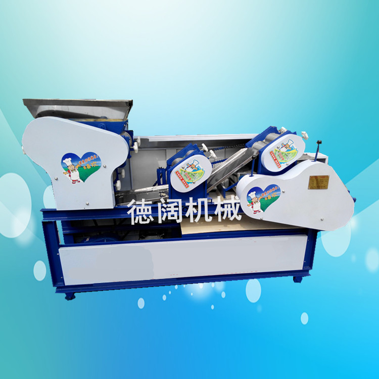 德阔系列饺子皮机、馄饨皮机是几组对辊连续辊压,一次成型原理设计制造的,它有电机,减速机装置,传动装置,两组供料粗压辊,一组合片轧实轧辊,一组轧实辊,一组轧光辊组成。该机组的配套设备是:拌面机与和面机。将和好的面坯倒在主机上面的料斗内,自动喂给粗轧辊,压出两块面板,然后合并进入合片轧实辊,在通过面槽引入第三道轧辊,压实压薄,进入压光辊内,精压轧光,面片通过模具一次成型。面片的厚薄是靠手轮调整器来调整,面片跑偏说明两辊间隙不一致,应调整两端手轮,使其均匀即可。精压辊光辊的间隙大与小和面片的厚薄相关,可根据当地需要进行调整。本机采用链条、链轮传动,传动部分为变速箱结构,持久*,并附加全自动回皮装置,减少了操作者的劳动强度,增加了功效。