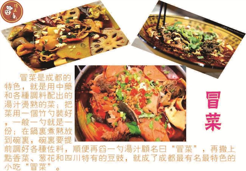 冒菜是成都的特色,就是用中药和各种调料配出的汤汁烫熟的菜;把菜用一个竹勺装好,一般一勺就是一份;在锅里煮熟放到碗里,碗里要提前调好各种佐料,顺便再舀一勺汤汁顾名曰"冒菜",再撒上点香菜、葱花和四川特有的豆豉,就成了成都*有名*特色的小吃"冒菜"。简单点说"冒菜就是一个人的火锅,火锅就是一群人的冒菜。