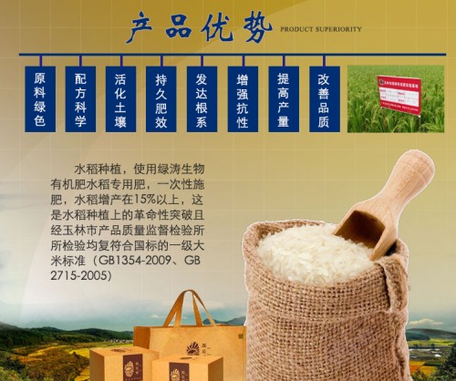 生产绿色大米自然少不了生态的肥料,而绿涛水稻*肥则为绿色大米的生产开辟了一条安全、*的道路!使用绿涛水稻*肥,可以一次性施肥(100公斤/亩),无需追肥,肥效长达120天!使用水稻*肥可以有效减少病虫害,减少打农药次数,大大节省人工。按照绿涛公司在玉林仁东镇,玉林新桥镇的的水稻试验基地反馈的数据来看,使用绿涛水稻*肥的水稻亩产增产15%左右,大米价格是市场价格的2-3倍。水稻*肥有机肥,不仅仅体现在增产节源,更多体现在生态大米的意义上,所产的大米通过玉林市监督检测局的检测均复合*一级大米的标准。(GB1354-2009、GB2715-2005)。