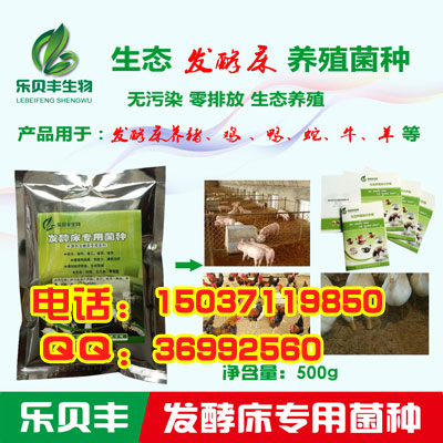 如何使用发酵床养鸡?发酵床养鸡菌种哪家好?乐贝丰发酵床养鸡菌种500g/袋,35元一袋 一箱10袋350元全国包邮,乐贝丰发酵床养鸡发酵床操作麻烦么?不麻烦,直接把菌种跟垫料混合均匀,控制好水分就可以了,发酵床垫料升温快,发酵分解鸡粪效果好,鸡舍没有任何臭味,告别氨气,我们*发酵床菌种,保证客户百分百操作成功,提供详细技术和相关配方,活菌含量大于100亿/g,我们是生产厂家保证活菌数、保证产品质量,减少一切繁琐的操作过程,直接跟发酵原料混合均匀密封发酵即可,乐贝丰生物郑重承诺产品无效退货退款,承担来回运费,您可以放心购买使用,乐贝丰生物厂址:郑州市高新产业区合欢街5号玖玖科技园,*欢迎您來厂莅临参观考察,乐贝丰帝亿菌发酵床养鸡均菌种全国咨询电话:150-3711-9850 王经理