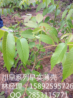 川早‘2’号核桃苗栽培技术要点:密植建园栽培适宜株行距为3m×4m,果粮间作适宜株行距为4m×5m,适宜树形为开心形,“四旁”树2~3层疏层形。大穴(80cm)整地,重施基肥100~200kg/穴,5%过磷酸钙泥浆蘸根。栽植时“三填两踩一提苗”,分层踩踏紧实,足量定根水。掏树盘,覆盖地膜或植物材料。 3月、5月追施*肥。4月、6月对弱树追肥1~2次。4月下旬至5月中旬,控制水分促花芽,摘心。7~8月扭枝促发育。落叶后至发芽前拉枝,萌动时选位刻伤改善树形。栽植1年半后因地、因树制宜施用生长调节剂。发现天牛及时以药棉毒杀,5月常规农药防治果象2次,6、7月防治炭疽病、黑斑病3次,防治介壳虫需要刮去树干粗皮再涂抹内吸剂毒杀。结合冬季修剪整形敲灭刺蛾蛹,春季发现食叶害虫及时防治。