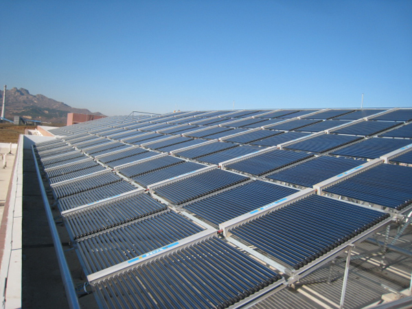 该项目集热器安装在6栋宿舍楼楼顶,真空管集热器面积总计3234平米,贮热水箱分散布置在各楼楼顶,总计容量250吨。