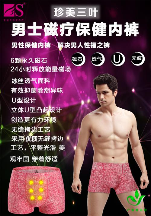 珍美三叶裤,一款新型保健内裤,是由广东珍三叶集团研发*的一款磁疗内裤,科学的将深海磁石巧妙的融合到面料中,采用高科技深海磁,加入磁性按摩纤维,突破传统工艺,通过涂点工艺制成,内裤实现360度均衡释压,能有效调节阴囊温度,具有增加神经传导速度及肌肉伸缩能力,放松肌肉,并排除积存体内的疲劳物质和乳酸等老化废物,对消除内肿,缓和酸痛起到很好的作用。