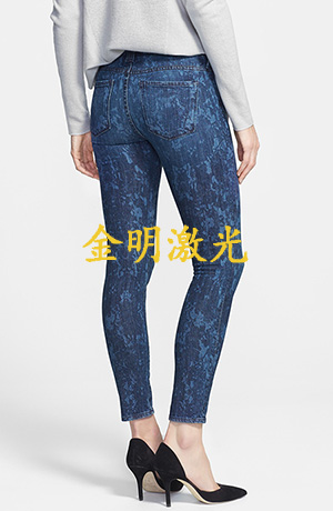 金明激光所研发的激光镭射印花牛仔加工工艺与设备能够度各种牛仔裤进行化样式的加工,减少了以往传统工艺的许多步骤,将牛仔裤摆在激光镭射机器里面,导入相应的团文件,通过激光束的照射,加工整条牛仔裤不到20秒钟即可完成。对环境造成的污染也随之降低,原本需要用到的一些化工原料或其它加工材料都随之减少。提升了效率又得到了一条满意的作品。