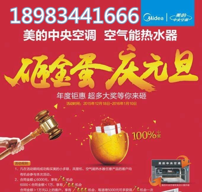 2016年元旦促销活动为:购买美的风管机、美的多联机、美的中央空调、美的空气能热水器等产品可以砸金蛋 庆元旦,100%中奖,苹果6S、三星手机等你拿。