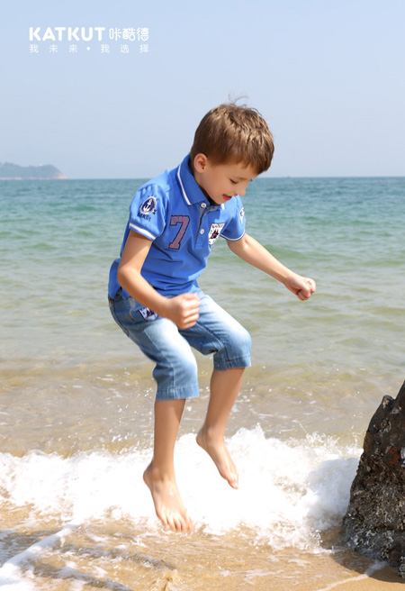 盛夏的阳光,火热的传递着能量,爱运动的男孩尽情的玩耍。一个帅气的身影,一个酷酷的弹跳,传递着运动正能量, POLO衫和牛仔短裤巧妙搭配,凸显时尚*风格。