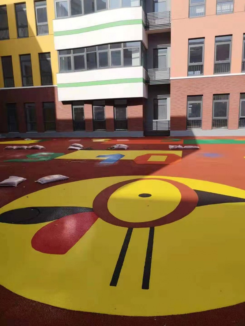 6、幼儿园EPDM塑胶对基础地面要求必须做到很平整,面层必须是光面,这样才能使塑胶跟地面粘接牢固,不脱层。
