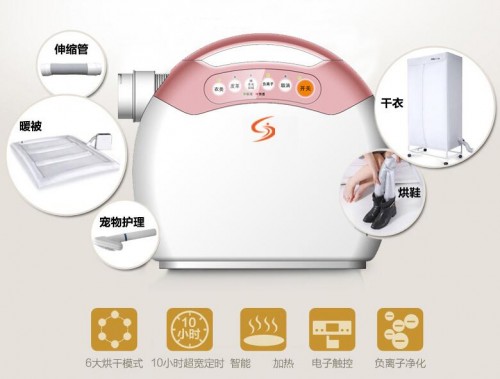 多功能烘干机有着干衣、烘鞋、暖被、取暖、除湿、冷风、负离子空气净化、臭氧杀菌消毒等功能,使用寿命长,安全可靠。烘干被褥时--直接将电能转为可控安全热能,20秒升温,2-5分钟*受热,5分钟-10分钟感受烘干效果 ,强迫被褥内部湿气外排,效果可以检测,可以亲身体验,使用25分钟被褥内部温度即可达到85度,对温度比较敏感的朋友需预先散热,以免因温度过高经久不散而不适。杀菌消毒:85度高温足够杀灭普通细菌病毒,预防传染病,保卫健康。