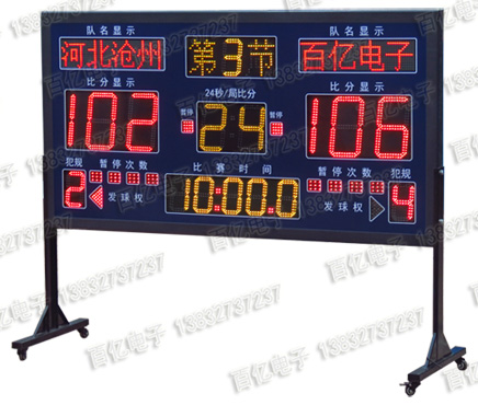 两队名称显示、比分、比局、场次、犯规次数、发球权显示、比赛时间、24秒计时、暂停次数、交换场地、暂停指示等显示内容。比赛时间可在1-90分钟内任意设置,24秒计时可1-99秒任意设置,计时到零有声光警报功能。比分*高可记199分。可以进行加减分作操。篮球计时可另配手柄单独操作,这样可两人分别操作计时器和比分方便快捷,并可与外部篮球计时器连接实现完全同步计时功能(以上功能可按用户需求订制)。