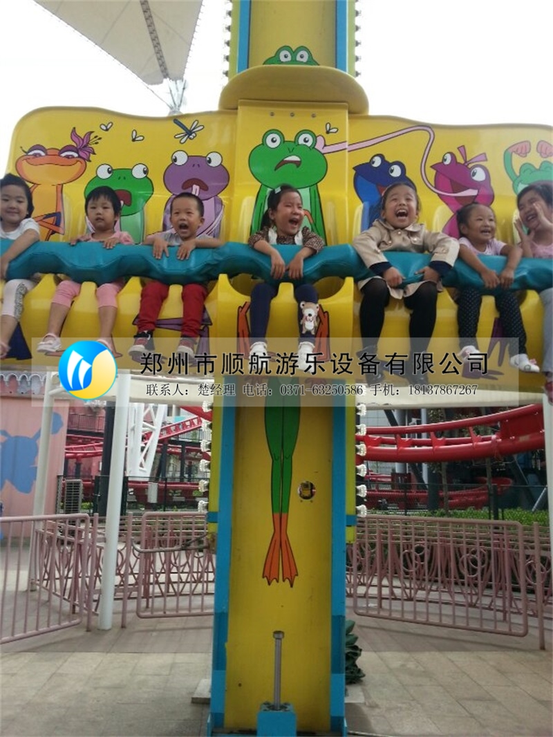 “青蛙跳”是一种用挠性件吊挂座椅作垂直升降动作属飞行塔类的游乐设备。其主要结构为龙门架、座椅、油缸。原理是:座椅用钢丝绳绕过龙门架的定滑轮与油缸连接,通过油缸不断的伸缩动作使坐于座椅上的游客被提升至高处再快速下放,后又旋即提升,而后不断上下跳跃动作。游客置身其中,犹如坐在大青蛙的背上蹦蹦跳跳,使广大小朋友深受刺激、兴奋异常。