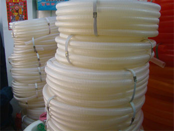 PVC树脂螺旋管为透明无毒软管,简称“牛筋管”。使用温度在-5℃+65℃,该产品质轻、透明、耐候性佳、弯曲半径小、耐负压力好。可广泛应用于食品、卫生行业、是工业、农业和工程上抽吸输送水、污水、C泥沙、油粉料的理想管材。</p><p>一、不存在吸瘪、折断、脱层等现象。因材料中富含抗老化、抗紫外线照射原料,故耐老化程度远远超过螺旋管。骨架部分(筋料)、软料部分全部透明,农业、工业使用时管内介质一目了然。 二、优越的耐低温性是其它任何一种管材无法比拟的,耐候性不受春夏秋冬任何季节的影响,弯曲自如(4寸管弯曲半径40 cm)。 三、不存在吸瘪、折断、脱层等现象。 四、因材料中富含抗老化、抗紫外线照射原料,故耐老化程度远远超过螺旋管,使用寿命是PVC螺旋管的几倍。五、PVC螺旋管是有毒产品,"牛筋管不但无毒",可用于饮食业、酒精业,还可输送酸、碱介质。