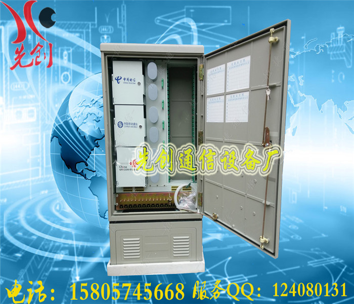 采用光缆交接箱模式-落地式,适合96-144芯。室外型光缆从下后部进,蝶形光缆从下前部进,熔配一体化光纤熔接盘在中部,光分路器托盘在上部。光分路器托盘按用户需求配置,1/2*16分路器终端托盘占用一个一体化托盘空间,1/2*32分路器终端托盘占用2个一体化托盘空间。