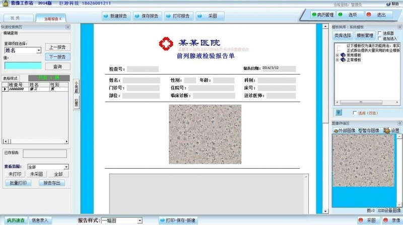 前列腺液检查报告系统软件,也叫做前列腺液分析系统、前列腺液检验报告系统、前列腺液图文工作站,连接医用显微检测设备,获取其影像、图像信息,实现影像信息在工作站端的同步显示,从而进行图像采集,形成图文诊断报告,实现病人的文字、图像、影像资料的管理及分析、统计等功能。