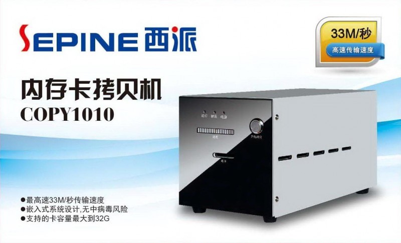 COPY1010全速SD卡拷贝机,插入一张母卡,可以同时拷贝10张子卡,一拖十,每根数据线采用33Mbit/s,四线方式极速拷贝,卡支持多快速度就有多快速度拷贝;