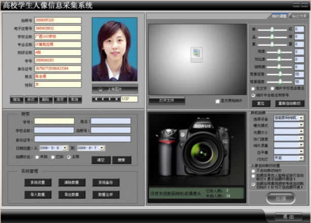 学生图像采集系统(BFI)采用我公司通过公安部检测的产品《BNS100二代身份证数码人像采集系统》(认证号为:公京检第051216号)的相关*技术,并结合学生电子图像采集的特定需求,进行了一系列的技术和业务的整合,使各大院校庞大的照片采集工作变得简单,不易出错;功能主要包括:联机拍摄,自动换背景,自动及手工裁切结合,自动套用标准相片颜色进行自动调整等功能模块,能快速自动地处理成满足要求的毕业证照相片,为这项工作节约大量的人力和物力;并具备自动排版打印输出相应证件等功能。并可针对已有数据库系统(人事系统、学籍管理系统等)进行数据接口,实现信息的整合。