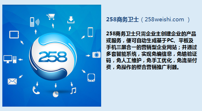258商务卫士拥有能生成内置优化功能的三屏合一商务网站,电脑端、平板端与移动手机端*展示,操作简单,利于搜索引擎搜录,实现网站关键词排名靠前!