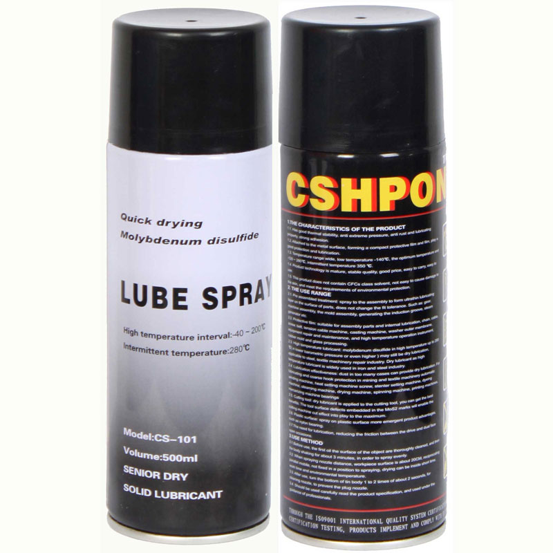 2.保护薄膜:干性润滑剂可以作预先润滑,即取即用。适用于装配机件及内部润滑,润滑链条、钢缆、螺丝、输送带、拉缆机、金属铸造机、垫圈外膜、一般机器的维修和保养,高温操作仪器,橡胶脱模,玻璃加工等.