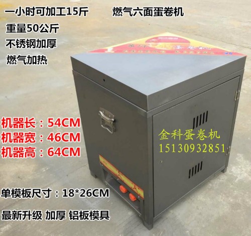 5.使用天然气蛋卷机所出的产品,黄金酥脆,老少皆宜!外形尺寸:54*46*63cm。整机重量:58KG。每日产量:100KG