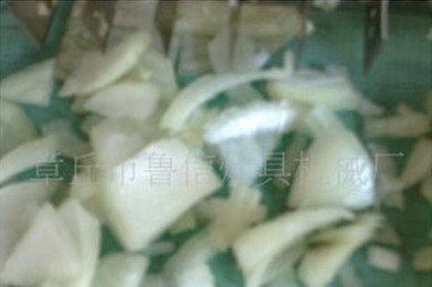 该机离心式切片机构用于瓜薯类硬才的切片,片厚可在一定范围内自由调节,竖刀部分可将叶类软菜和切好的片加工成不同规格的块、定、菱形、曲线等各种形状。因竖刀模拟手工切菜原理,所以加工表面平整光滑,成型规则,被切蔬菜组织完好、保持新鲜。
