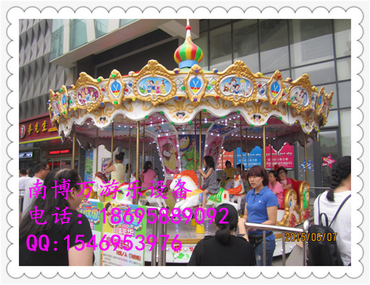 荥阳南博万豪华转马,顾名思义就是豪华的旋转木马,它是一种垂直轴类单转体起伏型游艺机,是模拟马厅的娱乐活动而设计的,该游艺机的上部设有彩色的锥形顶棚,顶棚的周圈装有五彩缤纷的玻璃钢装饰板,更显豪华气派,俨如华丽的马厅。它是游乐设备中的一种,转马启动之后转盘匀速转动,形态各异的转马随之上下起伏,使游乐者产生纵马扬鞭、驰骋疆场的感觉。本产品适用于公园游乐场、少年宫、生活广场、社区等人口密集流动场所。