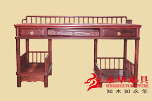【商品详细描述】:此电脑台通体为大红酸枝。台面攒框镶板,设有三屏式台面拦板。面下设抽斗两具,配有铜拉手。屉下各设一格,直腿圆足。造型简约素洁,线条流畅明快,于方寸间见空灵隽秀,清新飘逸。