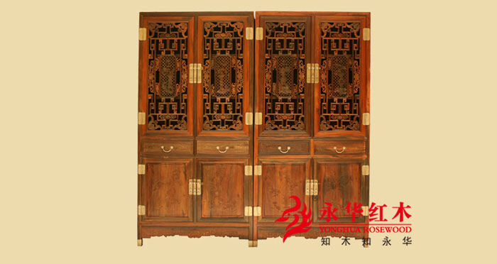 【商品详细描述】: 此福鼠吊金钱书柜由大红酸枝制成,成双而设。柜上部对开两扇门,门面镂雕福鼠吊金钱纹、四季平安纹、回字纹、花纹,布局严谨,节奏疏密有致,观感舒适。柜中部设有两具抽屉,配有铜拉手。屉下对开两扇门,浮雕四季平安纹。整体造型精致典雅,雕工精湛,于方寸间溢幽幽淡雅清新之韵。