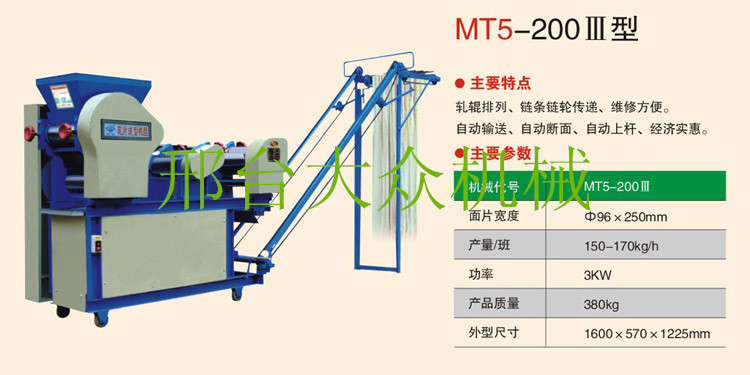 MT5—200全自动面条机是一种新型面条流水线设备,该机从进料到出面连续作业,具有高产*、省时省力、操作简便等优点,生产的面条韧性好、口感好。