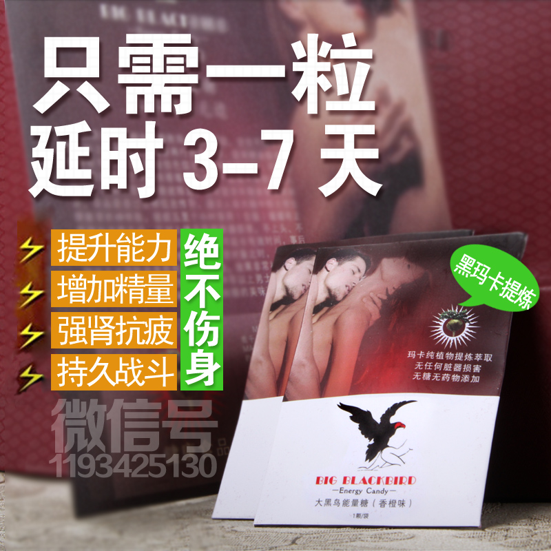 大黑鸟能量糖:*植物成分、不含激素、无任何副作用、一颗大黑鸟能量糖能持续3-7天,不会一直硬,只会在想房事时才会有反应,一粒见效,