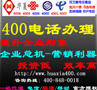 华夏智能400电话网上营业厅的业务包括有安装400电话,申请办理开通400电话,400电话申请办理开通,400电话查询,400电话价格咨询,400电话代理,400电话加盟,400电话招商,不知道您公司安装了400电话没有?如果还没有安装400电话,不妨安排人员跟我公司联系,安装一部400电话呢!如果有各种顾虑,我们现在提供400电话免费试用7天,7天后满意再付款使用!免费试用活动截止到2015年6月15日为止,本活动的解释权归华夏智能400电话网。