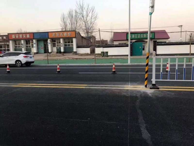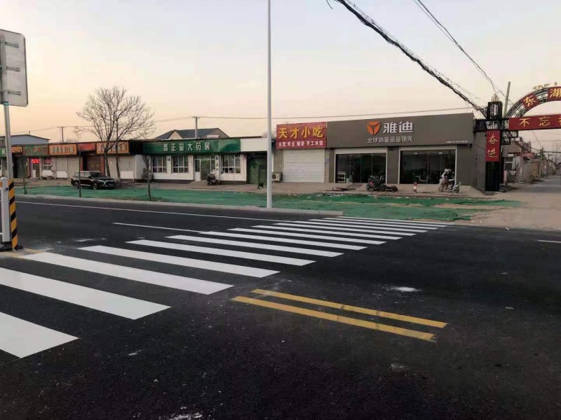 施工,眼前气温很低,热熔划线已经到了很难施工的时候。所幸的是,在前不久的一次寒潮天气来临之前,工程部门有幸为河北省廊坊市固安县固安镇东湖庄村的某条道路进行了道路