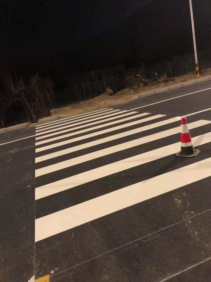 图示为涂划好通道线后的场景,该道路沥青较新,涂画出来的热熔标线比较醒目美观。