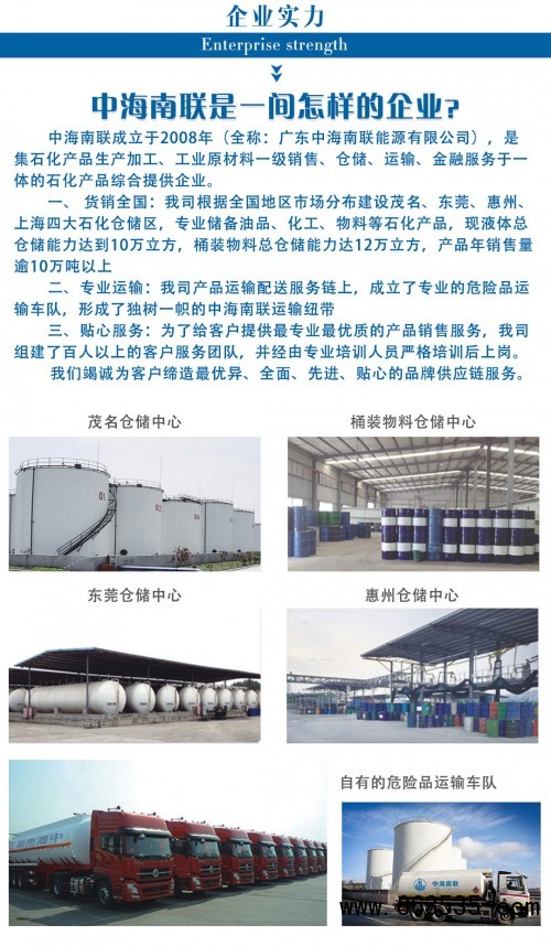 我司根据华南地区市场分布建设茂名、东莞、惠州三大石化仓储区,*储备油品、化工、物料等石化产 品,现液体总仓储能力达到8万立方,桶装物料总仓储能力达1万平方,产品年销售量逾10万吨以上;在产品运 输配送服务链上,我们成立了*的危险品运输车队,形成了独树一帜的中海南联运输纽带;同时为了给客户 提供***的产品销售服务,我司组建了百人以上的客户服务团队,并经由*培训人员严格培训后上岗。